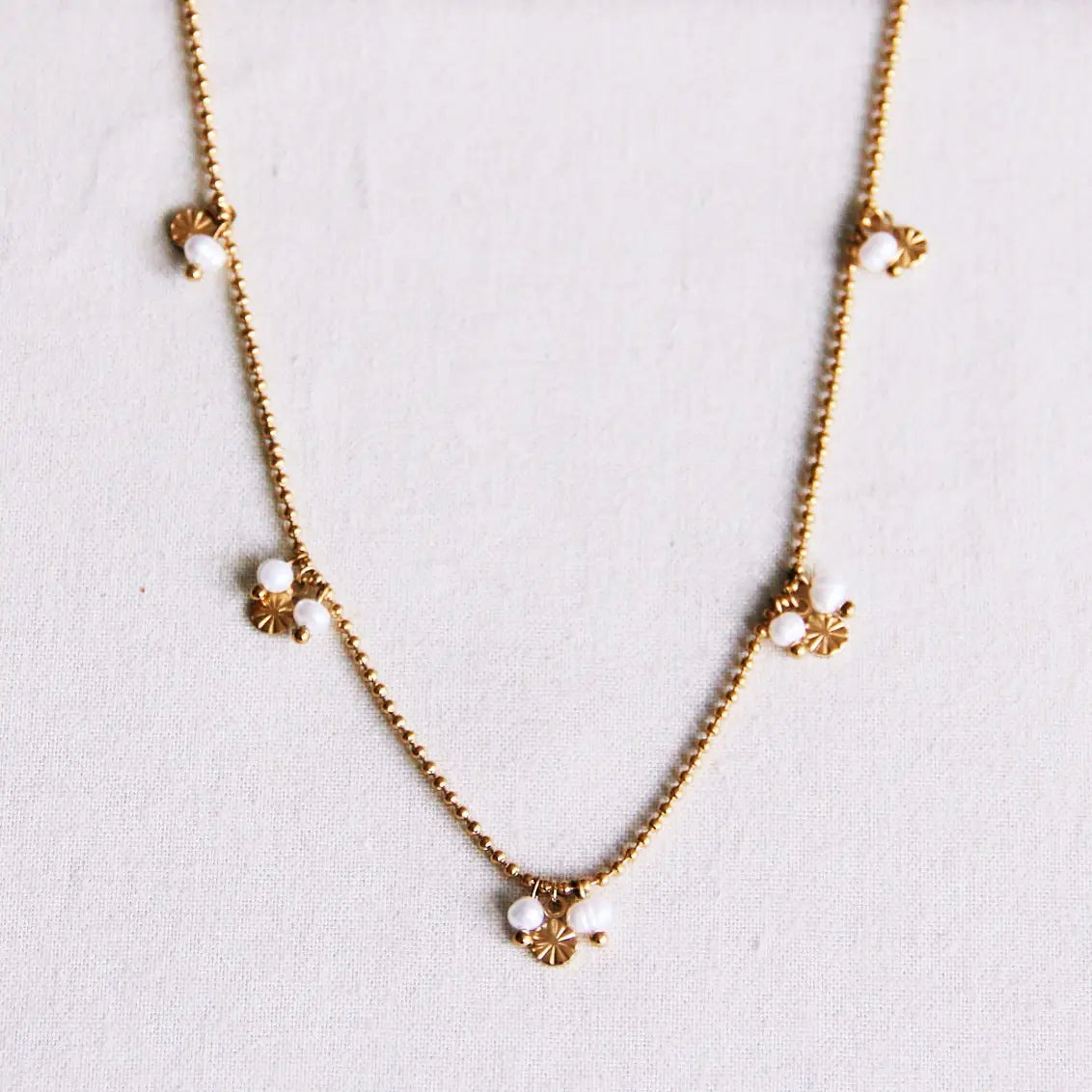 Brighten up your day with this cute, delicate ball chain necklace. The necklace features small, dainty coins and pearls. Made of stainless steel, so it does not discolour! The necklace is 15.35 in long, 2in adjustable