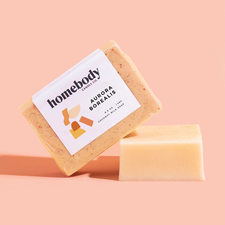 Our coconut milk soap is a soft + luxurious (detergent free!) soap containing coconut milk and made with phthalate-free, superior grade fragrance oils. Protected by individual shrink wrap and encased by our bright, floral labeling make these a perfect grab & go gift! Naturally coloured with turmeric powder. AURORA BOREALIS • An enchanting + magical blend of tropical fruit, sugared oranges, lemon, limes, mountain greens and sandalwood. Handmade in Chicago, IL.