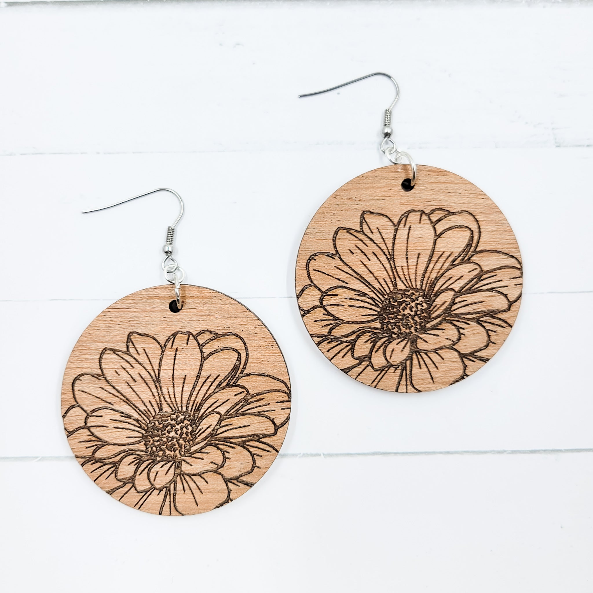 Engraved Zinnia Circle Wooden Dangle Earrings