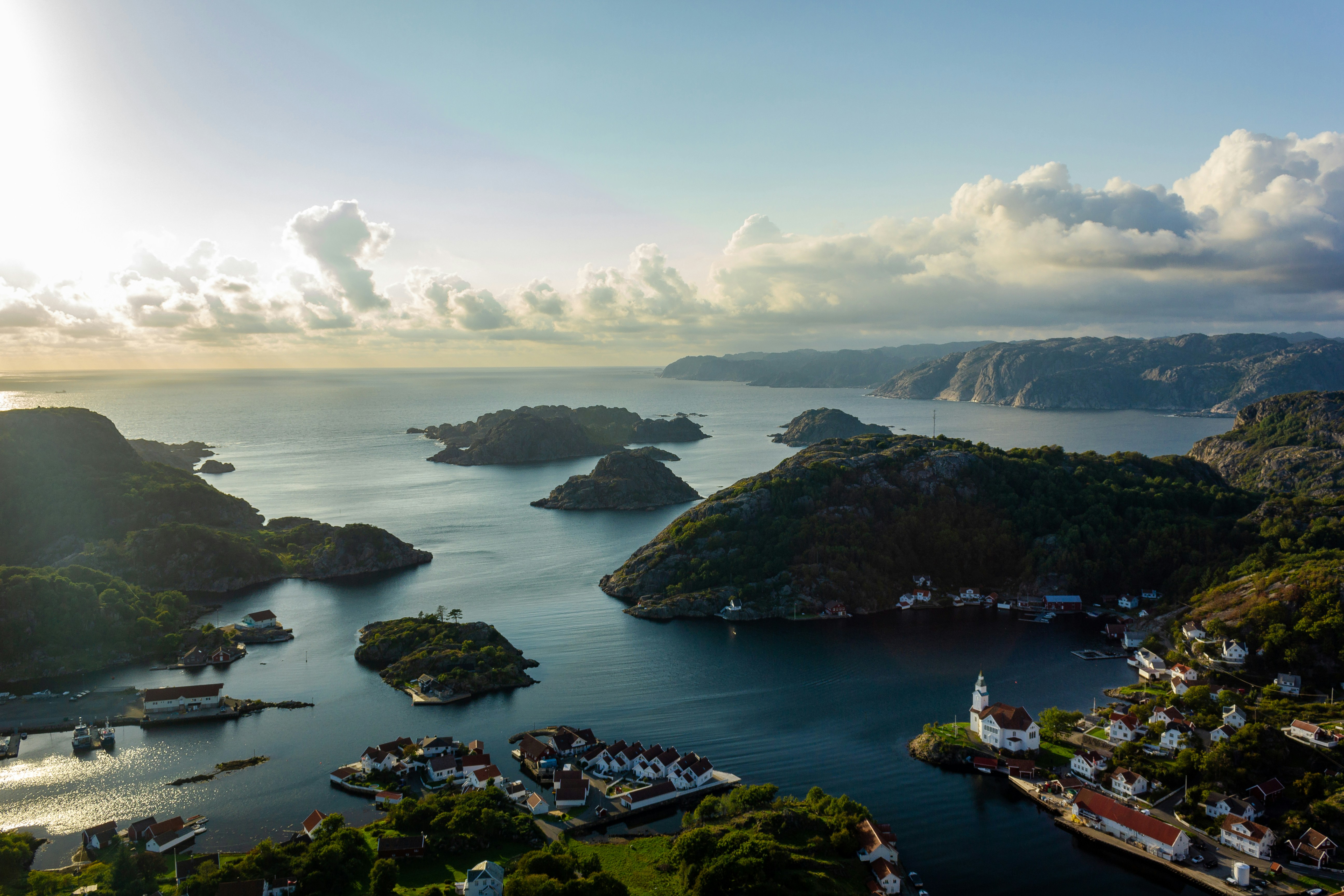 LandmarkTerrain: Narrow fjord channel reflects hillsides and distant boats. March low traffic yields serene waters; overcast mutes glare.